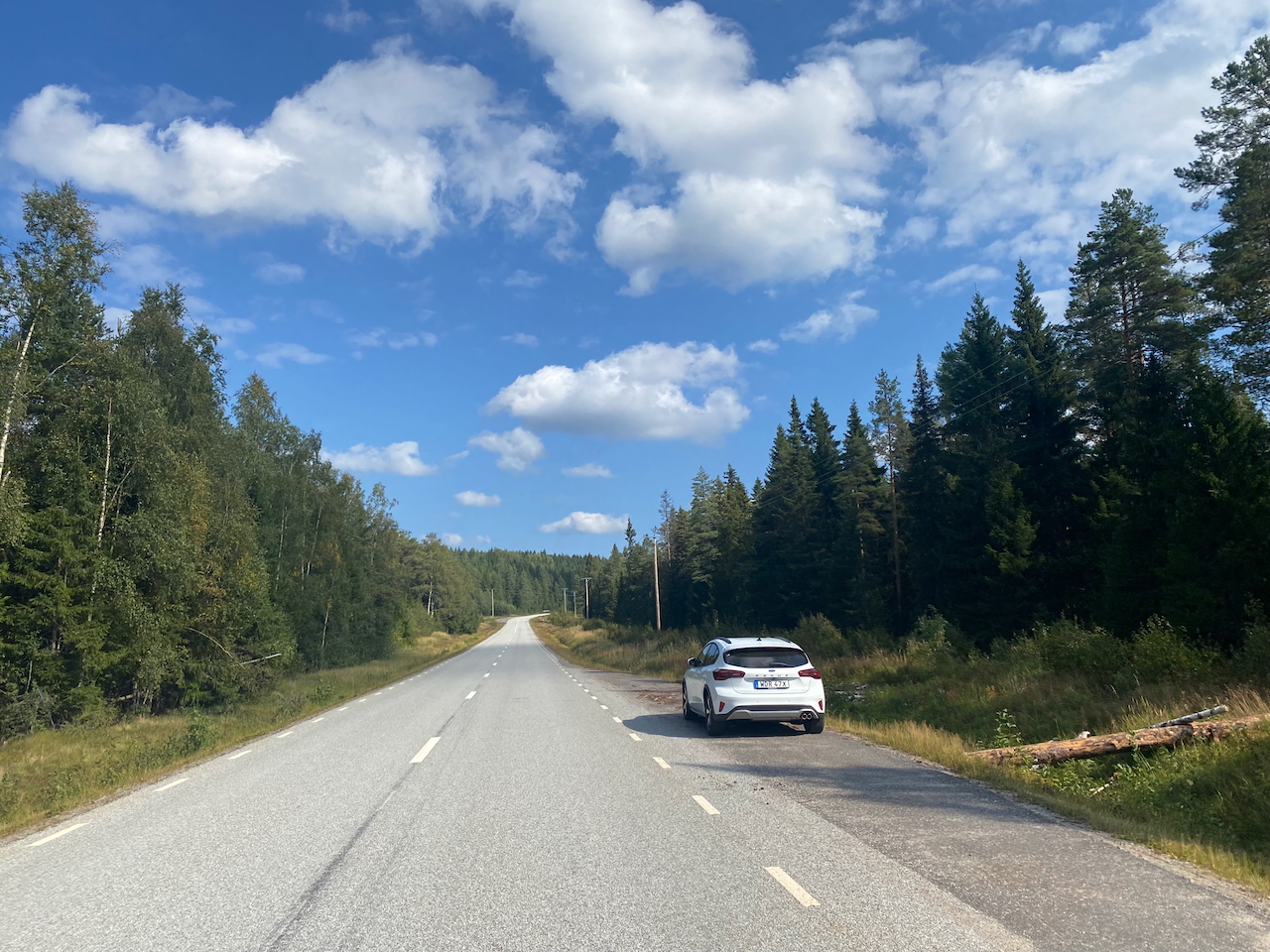 Unvermittelt wechselt die Asphaltdecke der X682 zur Schotterpiste. Trotzdem sind weiterhin 80kmh erlaubt. Die schafft ein deutscher Schützenpanzer, der ohnehin keine Rücksicht auf die Splitterwirkung des Schotters nimmt. Dem Ford Focus wollen wir das nicht unbedingt zumuten. An der Landschaft hingegen ändert sich nichts. Irgendwann löst ein geteerter Straßenbelag den Schotter wieder ab. Schneller fahren dürfen wir trotzdem nicht. Eine Raststätte wäre grad sehr willkommen, aber im weiten Umfeld gibt es überhaupt keine menschliche Behausung. So halten wir eben auf der freien Strecke an. Man könnte sein Geschäft ungestört an der Straße erledigen, aber die gute Erziehung verlangt nach einer passenden Vegetation als Deckung. Danach geht's unter einem strahlend blauen Himmel und bei angenehmen Temperaturen um die zwanzig Grad mit Tempo 80 weiter in Richtung Järvsö.
