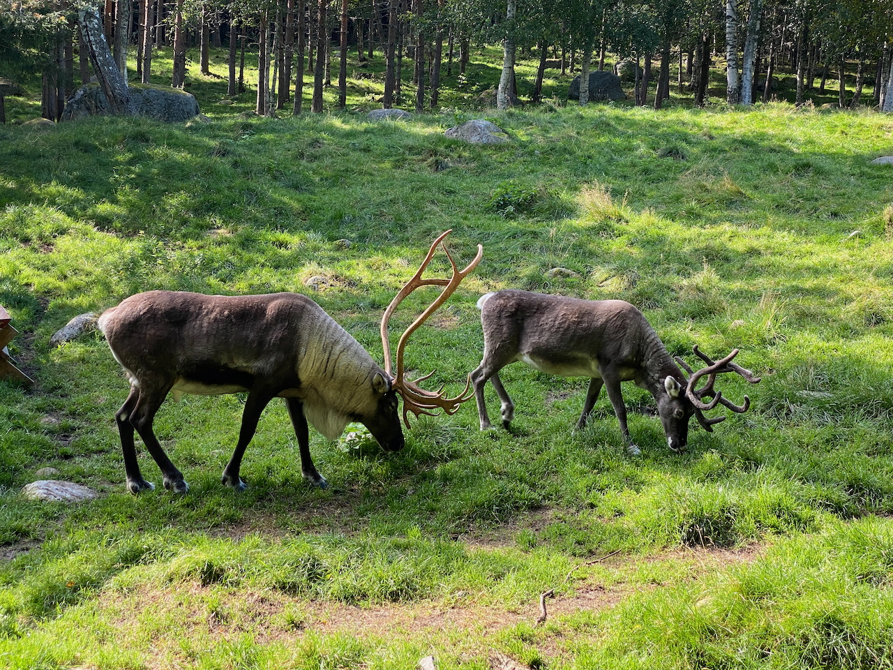 Die Wanderung führt uns einige Zeit am Gehege entlang, weitere Elche bekommen wir aber nicht zu Gesicht. Kurz darauf kommen wir an einem leeren Rentiergehege vorbei. Dem Faltblatt nach sollten im nächsten Gatter Moschusochsen auf uns warten, doch auch hier herrscht gähnende Leere. Das fängt vielversprechend an. Dem Faltblatt zufolge gibt es ein weiteres Rentiergehege, in welchem domnestizierte Rentiere gehalten werden. Und genau in diesem Gehege werden wir wieder fündig. Einige Rentiere kommen auf uns zu. Ihre Geweihe sind mit einem filzartigen Zeugs überzogen. Das Geweih des Rentier-Bullen ist hingegen glatt und spitz. Sein Interesse gilt in erster Linie einer Rentier-Kuh. Die anderen Tiere dieser Herde haben nur Augen für das bereitgestellte Futter. Wir beobachten das Ganze eine Weile und gehen dann weiter.