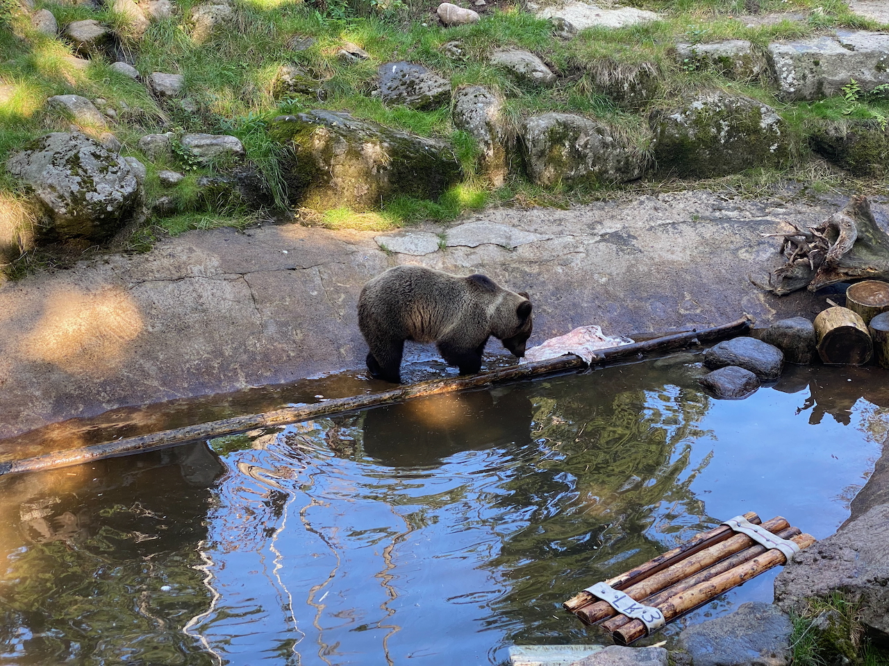 Der Steg führt inzwischen fünf Meter über den Erdboden entlang. Unter uns ist felsiger Waldboden, neben uns Baumwipfel. Am linken Handlauf tauchen übereinander angebrachte straffe Drähte auf. Führen diese Drähte Strom? Will ich das herausfinden? Warum das Ganze? Wie zur Erklärung taucht ein sehr hoher Zaun auf. Im nächsten Gehege muss etwas sehr gefährliches untergebracht sein, wenn man einen etwa fünf Meter hohen Zaun drum herum errichtet. Ein T'Rex vielleicht? Tollwütige Giraffen? Welches Tier in Skandinavien gehört derart weggesperrt? Ein Schild „Nicht berühren“ will jedwede Neugierde in Bezug auf die Drähte am Geländer unterbinden. Und nun ist auch klar weshalb: Auf dem zoologischen Präsentierteller direkt unter uns bewegt sich ein Braunbär. Ein zweiter Bär befindet sich am Hang weiter oben.