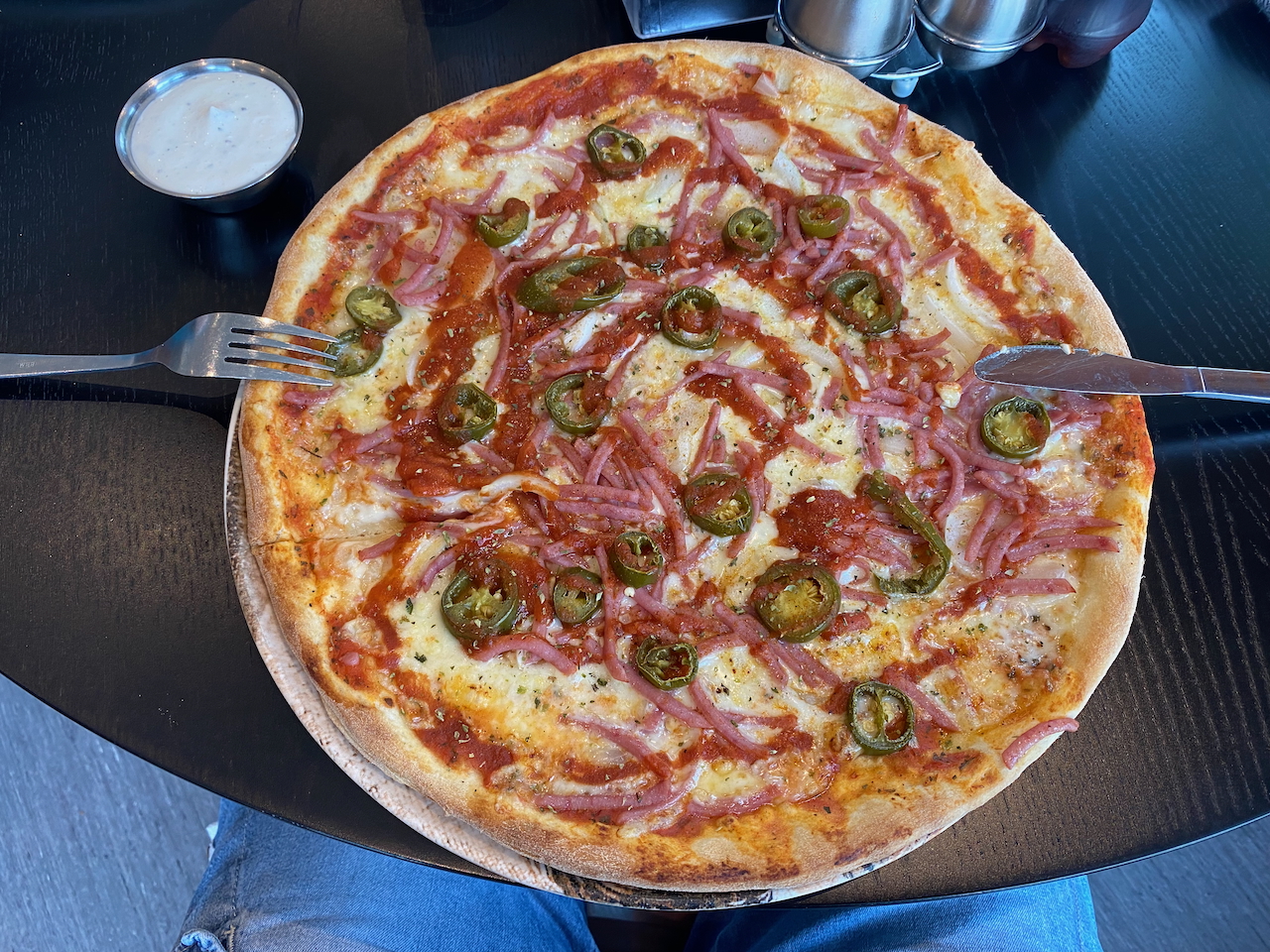 Nach einer erwartbaren Wartezeit kommt unsere Pizza, zu meiner Bestellung gehört zudem ein Schälchen Knoblauchcreme. Meine Azteka schmeckt richtig gut, ist aber auch verdammt scharf. Es dauert eine mit Jalapenjos gewürzte Weile, bis ich dahinter komme, dass die Knoblauchcreme der Pizza einiges an Schärfe nimmt. Wieder dazu gelernt.