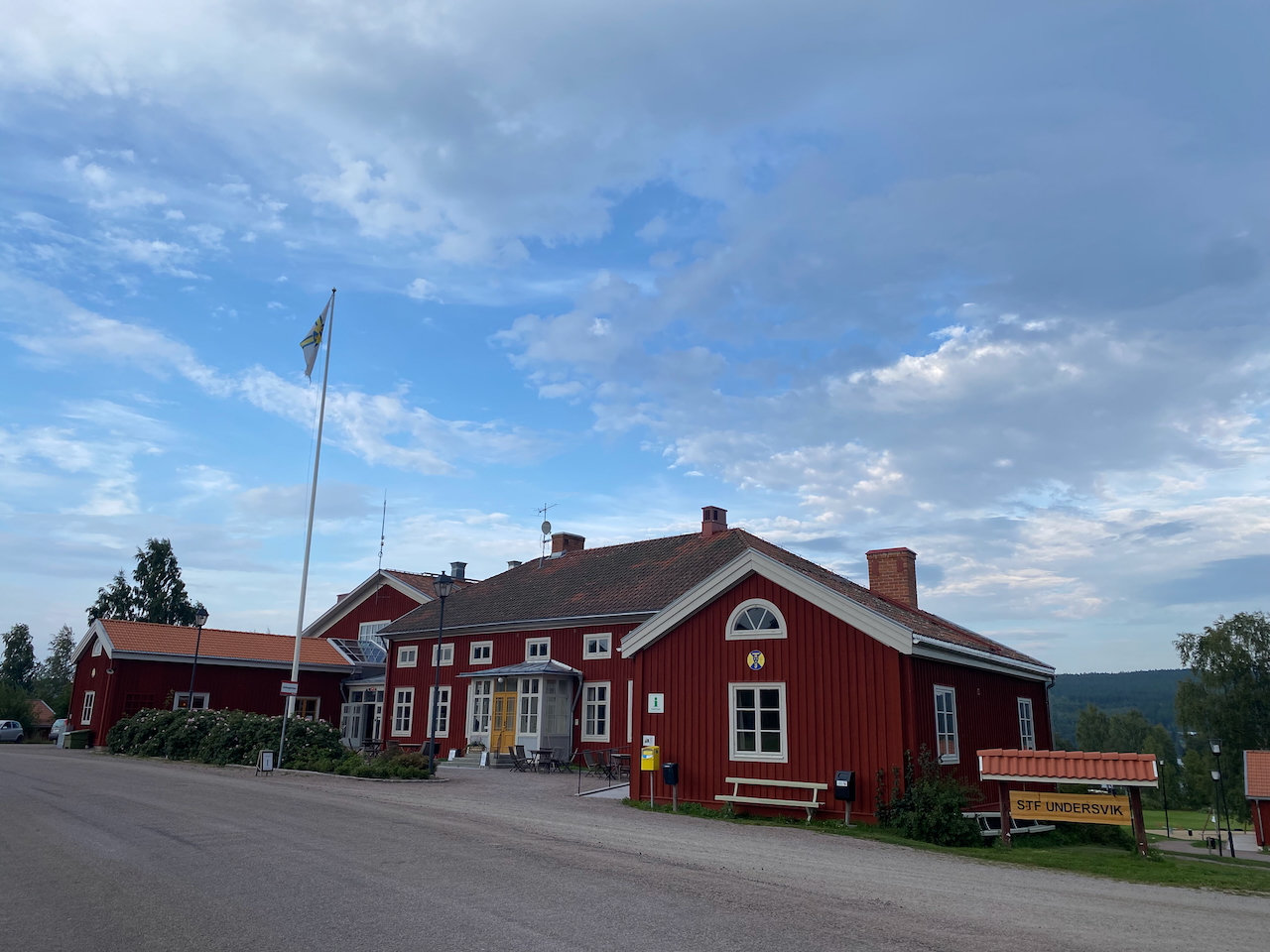 Die Häuserdichte nimmt zu, der Ort Undersvik ist erreicht. Der Fluss Ljusnan führt direkt am Ort vorbei. Wir biegen auf eine asphaltierte Straße und stoppen kaum zweihundert Meter später an einem Gebäudekomplex, dem STF Undersvik Gårdshotel och vandrarhem. Dieses Hotel und Wanderheim gehört dem schwedischen Tourismusverband. Nach dem Hotel am Stockholher Flughafen, dem B&B Hotel in Mora nun also dieses sehr ländlich geprägte Hotel. Vor dem Gebäude wird gerade fleißig in den Blumenrabatten gewerkelt. Uns Neuankömmlingen wird dabei keine Beachtung geschenkt. Gut, dann rein in die gute Stube.