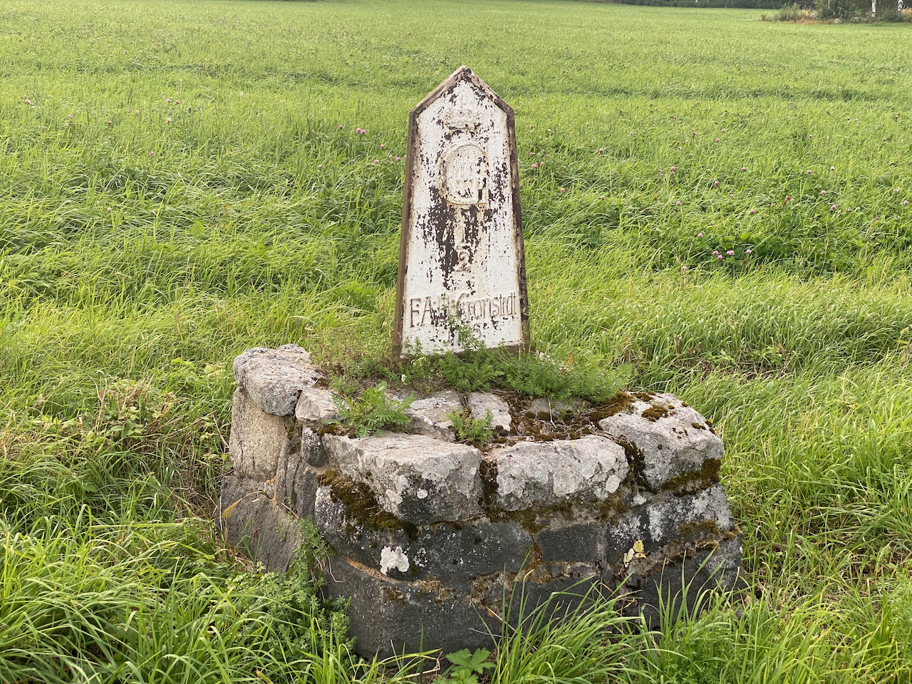 Bevor wir aufbrechen prüft Esther die Gegend auf eventuell versteckte GeoCaches und wird wieder fündig. Die Suche nach dem Cache führt uns zum hölzernen Glockenturm der Kirche. Doch egal wo wir suchen, wir können das Versteck nicht ausfindig machen. Missmutig geben wir die Suche auf und wenden uns unserer Route zu, auf welcher wir nun direkt am Hotel vorbei spazieren. Auf der anderen Staßenseite, genau gegenüber vom Hotel, entdecken wir einen dieser Meilensteine, die uns auf der Fahrt recht häufig begegnet sind. Endlich gibt es eine Gelegenheit, einen vom schwedischen König Gustav III. im Jahr 1785 höchstpersönlich aufgestellten Meilenstein zu fotografieren. Die Kirche nebenan wurde vier Jahre später ebenfalls von Gustav III., nun, wenn schon nicht aufgebaut, aber zu mindestens eingeweiht.