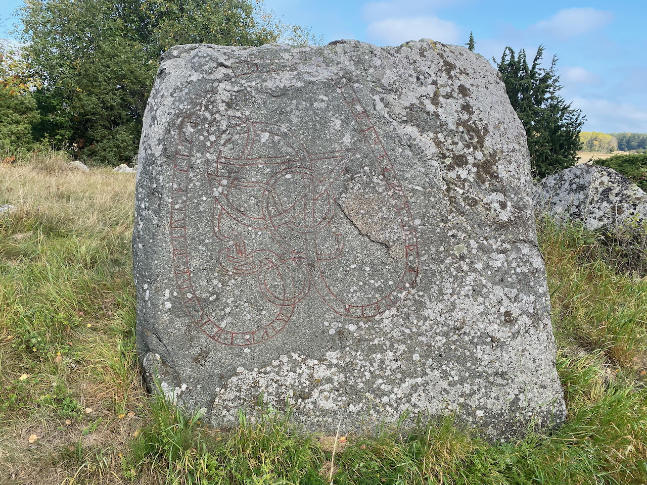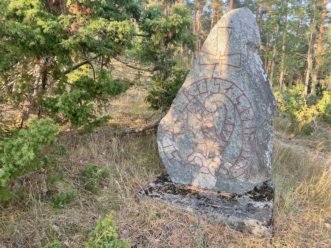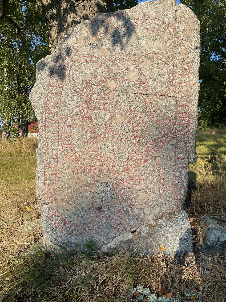 Die von uns besuchten Runensteine unterscheiden sich im Grad der Erhaltung beachtlich. Einer, möglicherweise der größte Runenstein, den ich bislang überhaupt zu Gesicht bekomme, muss einst gesprengt und später wieder zusammengefügt worden sein. Entsprechend schlecht hier ist auch der Zustand der Runen. Anderen sieht man ihr etwa tausendjähriges Alter kaum an. Hier und da sind die Runen vor nicht langer Zeit neu ausgemalt worden, bei anderen hat man Probleme, überhaupt noch etwas erkennen zu können.