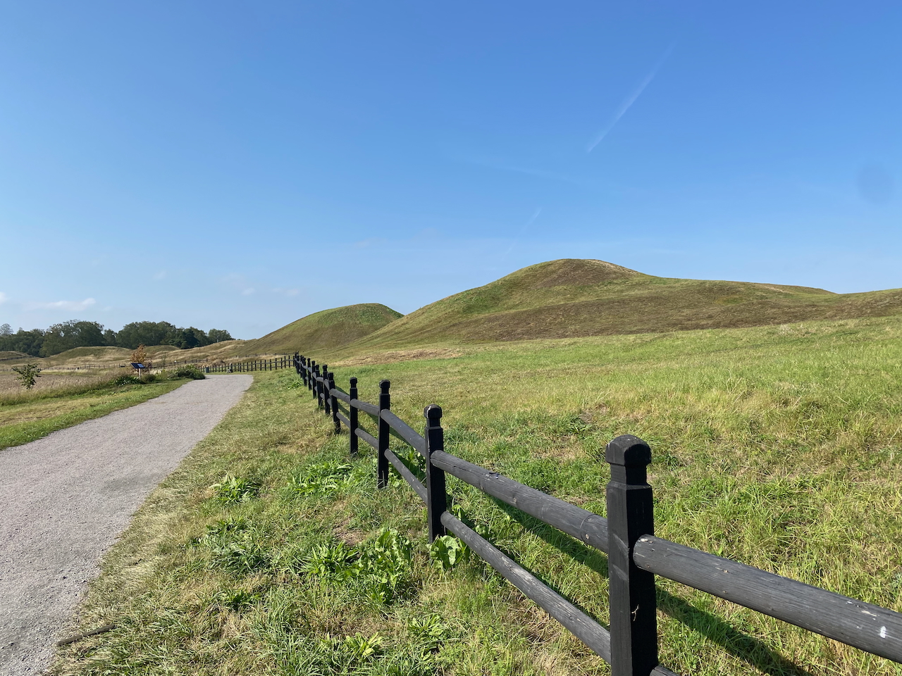 Bevor wir den Rundgang beginnen, besuchen wir den Museumsshop. Für den Besuch des Museum fehlt uns die Motivation, auch weil wir dort interessante Informationen erst mit einer App ins Deutsche übersetzen müssen. So ein Rundgang durch den Museumsshop ist immer recht interessant. Neben vielen Fachbüchern in schwedischer und englischer Sprache gibt es Spielzeug für die Kinder, nachempfundener Schmuck der Wikingerzeit und jede Menge Socken. Jedoch nichts kann uns zum Kauf bewegen. Selbst die Magneten gefallen uns nicht. Also verlassen wir den Museumshop und folgen einem Rundweg, der uns zu den großen Hügelgräbern führt. Diese haben die seltsam uninspirierenden Namen Östhögen, Mitthögen und Västhögen.