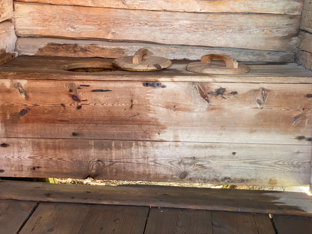 Wir kommen an einem alten Plumpsklo vorbei. Privatsphäre war zur Zeit der Nutzung dieser Bedürfnisanstalt ein Fremdwort. Auf diesem Klo konnten zwei Personen zeitgleich ihr Geschäft verrichten. An kalten Wintertagen sicher es auch ganz angenehm, nicht allein mit dem Hintern festzufrieren. Man konnte es sich mit der Schwiegermutter gemütlich machen und während man sich gegenseitig wärmt und übers Leben philosophiert, lässt man das eine oder andere nach unten sausen. Klitsch! Klatsch! Hände hoch, bei wem einstmals die einzige Toilette ein unbeheiztes Plumpsklo draußen auf dem Hof war.