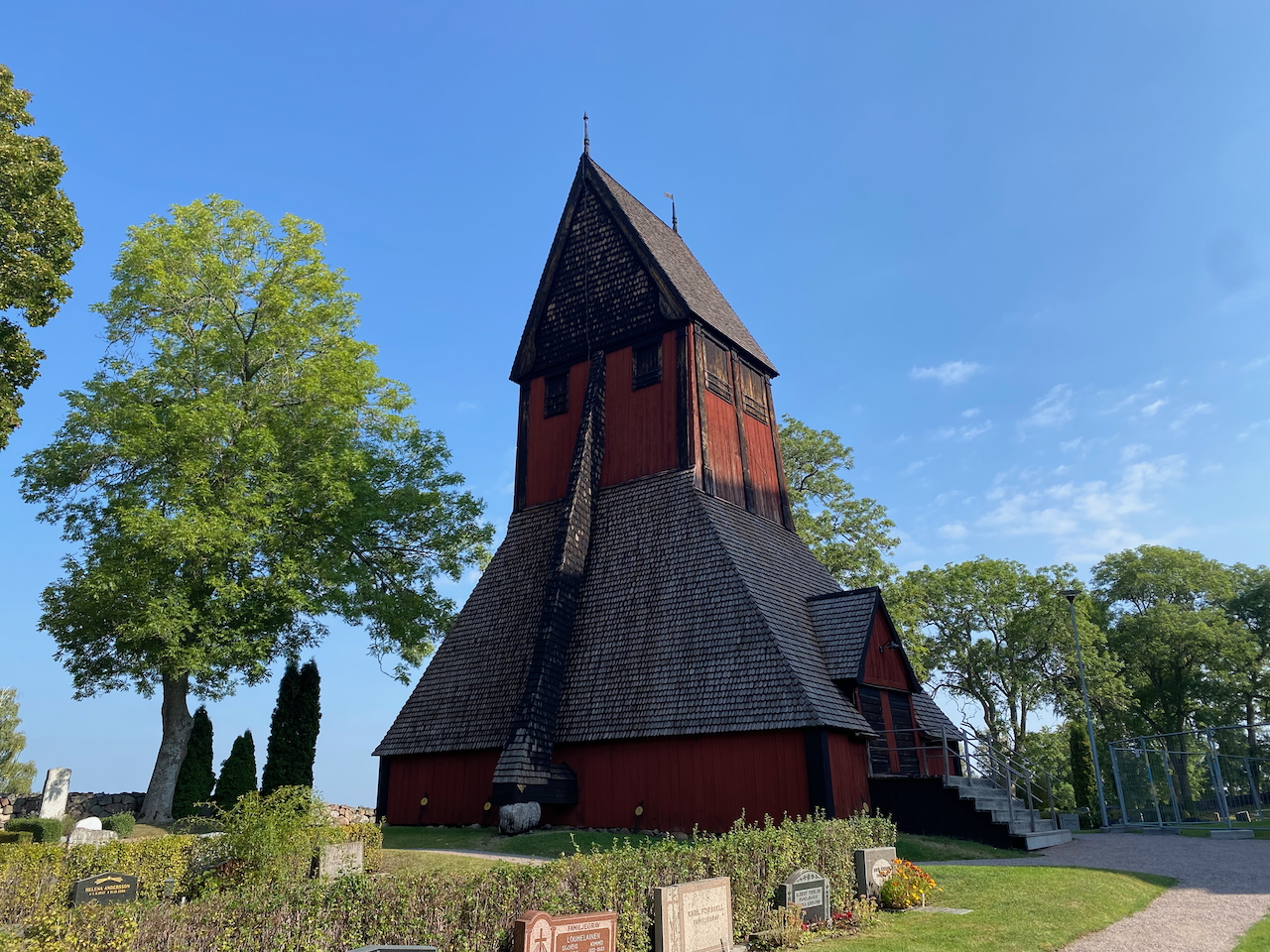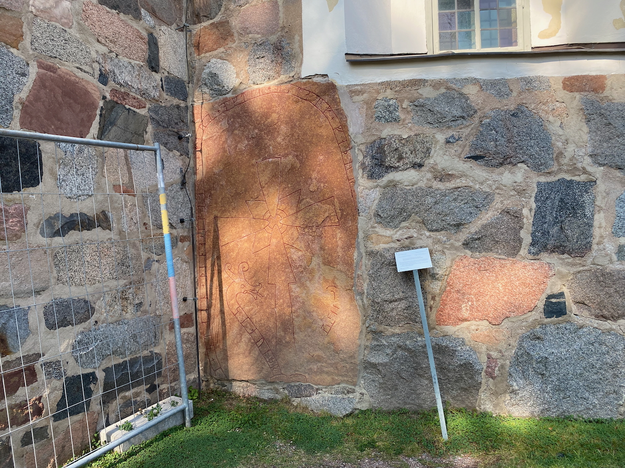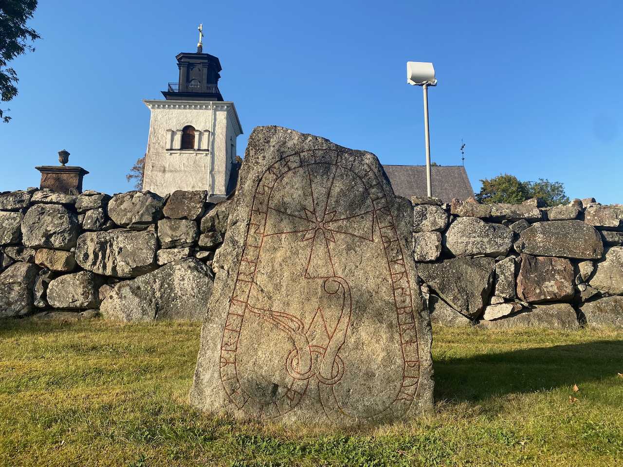Zurück nach Alt-Uppsala. Eine beeindruckende alte Kirche mit einem daneben stehenden hölzernen Glockenturm und umliegenden Friedhof befindet sich ebenfalls auf der eben beschriebenen Fläche. Von der ursprünglichen Größe der Kirche ist bestenfalls die Hälfte erhalten geblieben. An der Außenmauer erkennt man an einigen Stellen die Reste ehemaliger Anbauten. Beim Umschreiten der Kirche entdecken wir einen recht gut erhaltenen, in die Kirchenmauer eingefügten Runenstein. Dieser wird selbstverständlich sofort fotografiert und die angebrachte Beschreibung mittels Google Übersetzer ins Deutsche übersetzt. Als die Kirche vor rung neunhundert Jahren gebaut wurde, dann wohl an der Stelle jenes sagenumwobenen Tempels der Wikingerwelt. Dabei wurde auch ein weiterer Königshügel abgetragen, von dem ein Rest als kleinerer Hügel vor der Kirche übrig blieb.