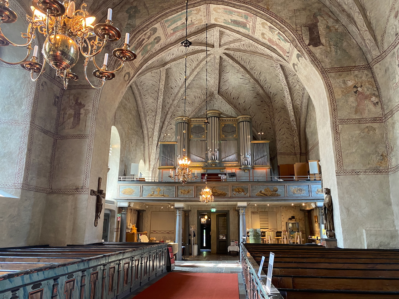 Nun haben wir genug Geschichten rund um die Kirche erzählt. Es ist an der Zeit das heilige Gemäuer von innen in Augenschein zu nehmen. Die Kirche präsentiert sich wie erwartet sehr schlicht. Nichts zu sehen von der prunkvollen Gestaltung katholischer Kirchen wie vergleichsweise im Süden Deutschlands. Die Wände seit Alters her mit Symbolen und Verzierungen bemalt und daran hat sich bis heute nichts geändert. Eine Tafel weist darauf hin, dass sich in der Kirche das Familiengrab der Familie Celsius befindet, dessen berühmtestes Mitglied Anders Celsius ist. Anders Celsius, seines Zeichens Professor der Astronomie, erdachte einstmals die Temperaturskala Celsius, die vielleicht dem einen oder anderen ein Begriff sein dürfte. Die metallene Grabtafel der Familie Celsius können wir an einer der Außenwände der Kirche ausmachen. Nach dem wir im Mai diesen Jahres ein Denkmal zu Ehren Daniel Fahrenheits in Danzig besuchten, ist ein Besuch dieser Kirche eigentlich die logische Folge. Oder purer Zufall. Egal. Wir schreiten die Reihen der Bänke ab und genießen die angenehme Ruhe in den altehrwürdigen Mauern.