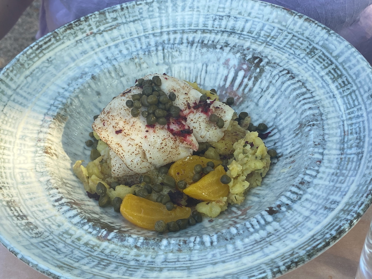 Esther bestellt sich Flunder mit Kapern und eine Kartoffelsuppe gibt es für denjenigen, der Kapern nicht mag. Kaffee und stilles Wasser ist auch hier kostenlos. Wir decken uns mit Getränken ein und suchen einen freien Tisch auf der terrassenartigen Fläche vor dem Café, finden aber alle Schattenplätze besetzt. Die praktische Lösung steht an einer Wand gelehnt: Sonnenschirme nämlich. Einen davon schnappen wir uns und besetzen einen freien Tisch, der in der prallen Sonne steht. Der Sonnenschirm jedoch, den man in ein Loch in der Tischmitte steckt, benötigt eigentlich einen Schirmständer. Einen solchen gibt es aber nicht. Leichte Windstöße lassen den Sonnenschirm unablässig auf und ab hüpfen und ich will mir nicht ausmalen, was passiert, wenn ein ordentlicher Windstoß den Schirm zum Fliegen bringt. Mit einer Hand halte ich den Sonnenschirm deshalb fest und merke, dass mir das schnell zu viel wird. Wie will man hier in Ruhe zu Mittag speisen, wenn man damit beschäftigt ist den Schirm am Abheben zu hindern? Als ein Tisch im Schatten frei wird wechseln wir kurzerhand die Stellung. Natürlich wird auch der Sonnenschirm vorher zurückgestellt. Auf dem neuen Tisch steht das Geschirr der letzten Gäste. Langsam sind wir es leid den Schweden alles nachräumen zu müssen. Wir stellen das Geschirr auf einen leeren Nachbartisch und wundern uns noch nicht einmal über die zunehmende Anzahl leerer Tische.