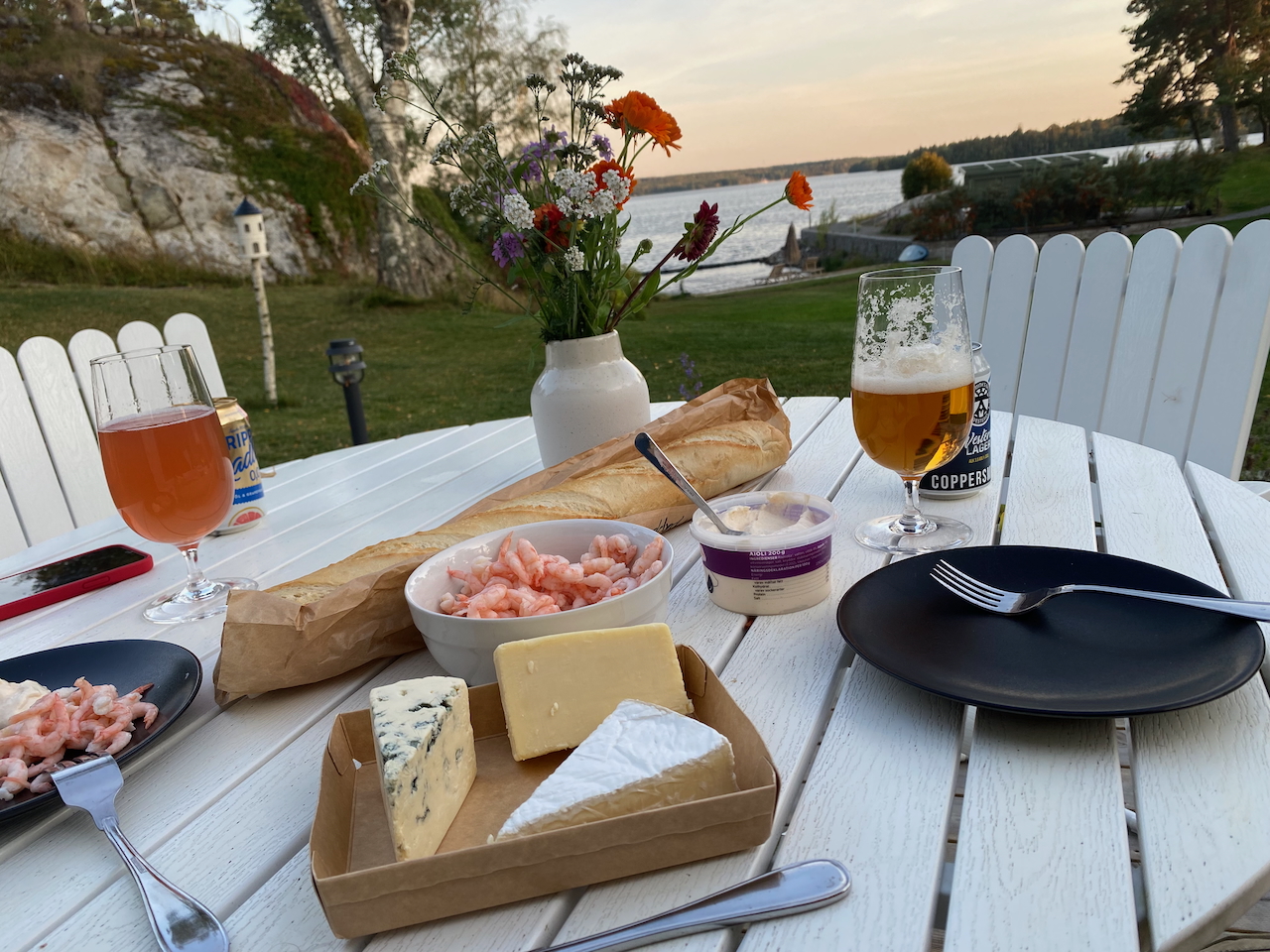 Das traumhafte Wetter wollen wir nutzen um unser Abendessen auf der Terrasse genießen zu können. Der Tisch ist schnell gedeckt. Es gibt Garnelen, Aioli, Baguette und Käse. Lauter gesundes Zeug - soweit wenn man es nicht so genau mit der gesunden Ernährung nimmt. Es schmeckt gar nicht übel. Bevor wir uns nach drinnen verziehen räumen wir die Polster der Sitzecke weg. Dabei stellen wir uns höchst umständlich an und kommen mit den Polstern und den Planen nicht wirklich bis überhaupt nicht klar. Das Ganze will einfach nicht recht passen und ruft irgendwann den Gastgeber auf den Plan. Wir schwätzen eine Runde und er erklärt uns noch einmal, wie das mit den Abdeckung der Sitzecke eigentlich gedacht war. Die Ausführungen seiner Frau haben wir offensichtlich missverstanden. Die Polster verbleiben auf den Sesseln und werden dort und nirgendwo anders mit der Plane abgedeckt. Schau an - schon passt's.