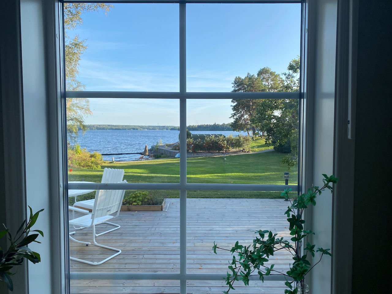 Allerdings redet unsere Gastgeberin schnell und viel, dass nur die Hälfte vom Gesprochenen verstanden wird. Es wäre jedoch unfreundlich ihren wohlgemeinten Redeschwall zu unterbrechen. Es erklärt sich ohnehin vieles von selbst. Bucht man übrigens dieses Hotel über gängige Onlineportale wie etwa Booking.com, dann bekommt man dort Fotos des Zimmers gezeigt, welches für fast zwei Tage unseres sein darf. Das Bett schaut ungemein einladend aus und im Bett liegend bekommt man einen wunderbaren Blick auf den Mälarsee. Die wenigen Schränke sind mit modernen Schubläden ausgestattet. Es gibt eine eigene Klimaanlage, ausreichend Steckdosen, eine Netzwerkdose und viel zu viele Lichtschalter. Die Suche nach dem passenden Schalter lässt uns während unserer Anwesenheit nicht selten verzweifeln. Von außerhalb des Hauses muss es schon ulkig gewirkt haben, wenn alle möglichen Lampen unseres Zimmers immer wieder kurz aufleuchten, bis wir uns endlich auf eine Beleuchtungsquelle geeinigt haben.