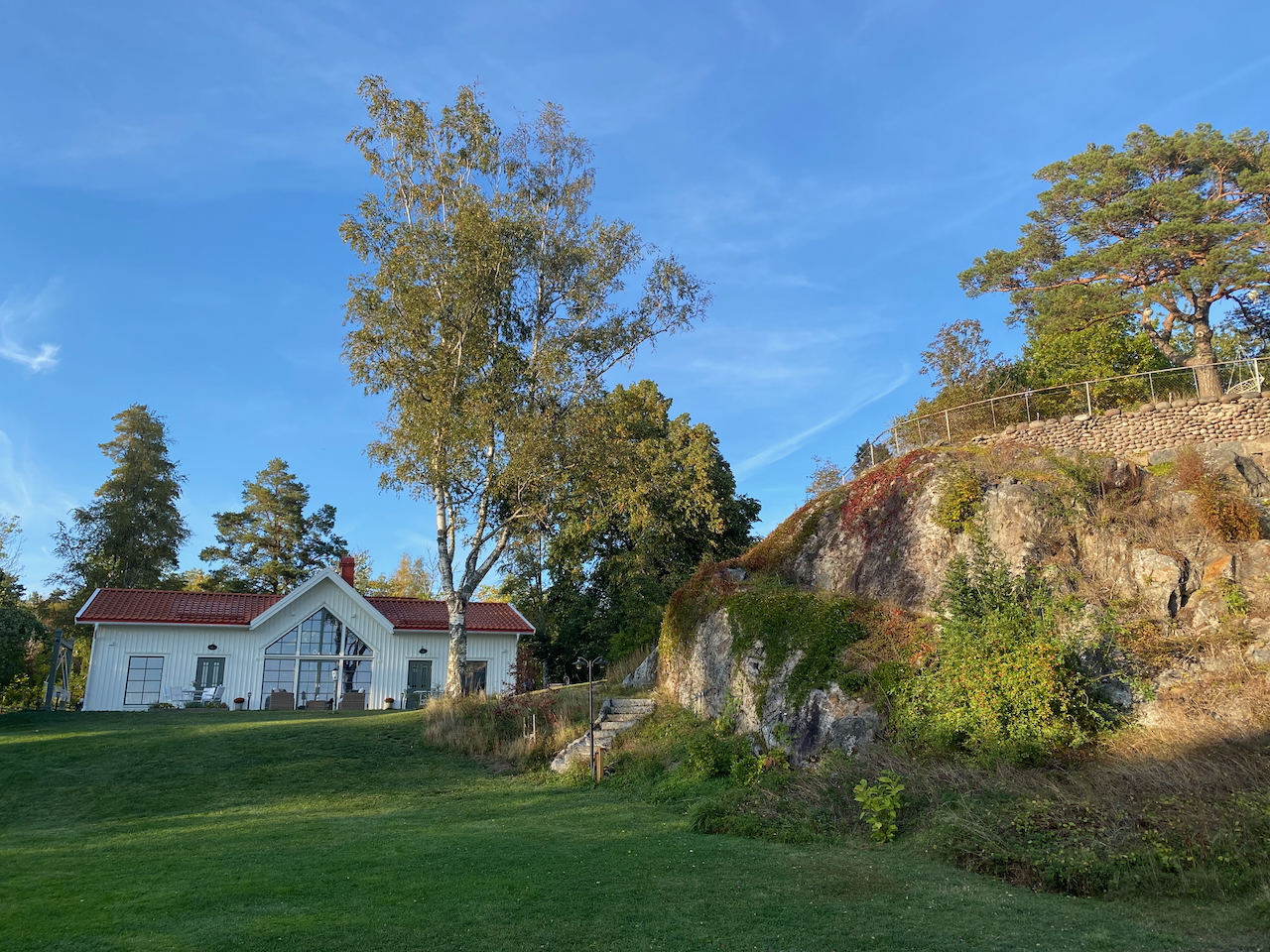 Natürlich gibt es auch hier einen perfekt geschnittenen Rasen. Ein emsiger Rasenmähroboter irrt unablässig über den Rasen und kürzt die Grashalme mit einer grenzenlosen Geduld. Die Grünfläche führt hinunter zum See, wo ein kleiner Strand mit zwei Strandliegen auf Entspannungssüchtige wartet. Die gesamte Szenerie beherrscht ein gut fünf Meter hoher und zehn Meter breiter Felsen. Ein kleiner Fussweg führt auf den überdimensionalen Stein hinauf. Oben auf dem Felsen laden einige Sitzmöglichkeiten sowie Schaukel, die an einer knorrigen Kiefer befestigt ist zur Fernsicht ein. Ein traumhafter Platz gerade jetzt am späten Nachmittag mit fabelhafter Aussicht über den See, die ich aus eben jener Schaukel sehr genieße. Das „Bastuviken Bed & Breakfast & Lake Spa“ schaut im warmen Licht der langsam untergehenden Sonne gleich nochmal so hübsch aus. Spätestens jetzt sind ein paar Worte über das aktuelle Wetter fällig. Sämtliche Wetterprognose für das Wetter in dieser Region haben Recht behalten. Seitdem wir in Uppsala die E4 verlassen haben scheint die Sonne. Die Temperatur ist wie versprochen auf warme zwanzig Grad angestiegen. Nach zwei Tagen im Regen sitzen wir nun im schönsten Sonnenschein auf diesem Felsen und haben das nasskalte Wetter der letzten tage schon längst verdrängt.