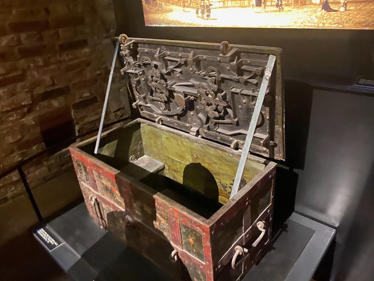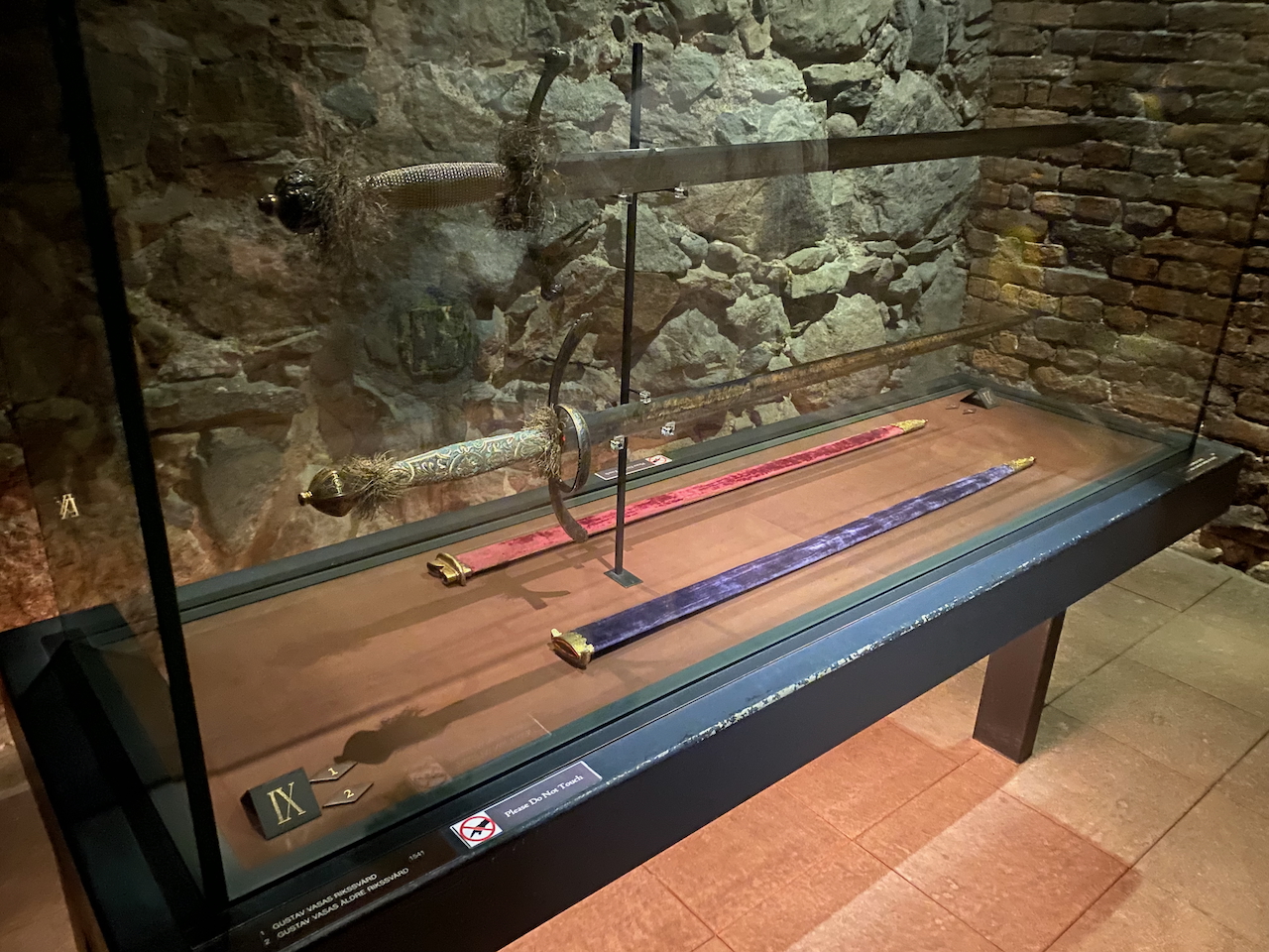 Wir starten die Besichtigungstour im Keller, genauer: in der königlichen Schatzkammer. Schätze in Form von Bergen aus Gold und Edelsteinen gibt es nicht zu sehen. Da ist eine Sammlung von Kronen verschiedener Epochen, nebst Königszepter und anderen königlichen Insignien. Ein lilafarbener königlicher Umgang wird in einer Vitrine ausgestellt. Ein silbernes Taufbecken und ein alter Wandteppich schaut recht interessant aus. Was mich wirklich beeindruckt sind die beiden Schwerter Gustav Vasas. Ob diese in Mora dabei waren, als Gustav Vasa dort verweilte? Oder vielleicht an der Schlacht bei der alten Brücke bei Uppsala? Die Schatzkammer hier wirkt eher wie ein Museum. Und dann finde ich genau das, was man in einer königlichen Schatzkammer zu sehen erwartet: Schatztruhen. Zwei Truhen sehe ich, beide sind sehr kunstvoll verarbeitet und mit einem technisch verblüffenden Schließmechanismus versehen. Und beide sind völlig leer. Schweden ist Pleite!