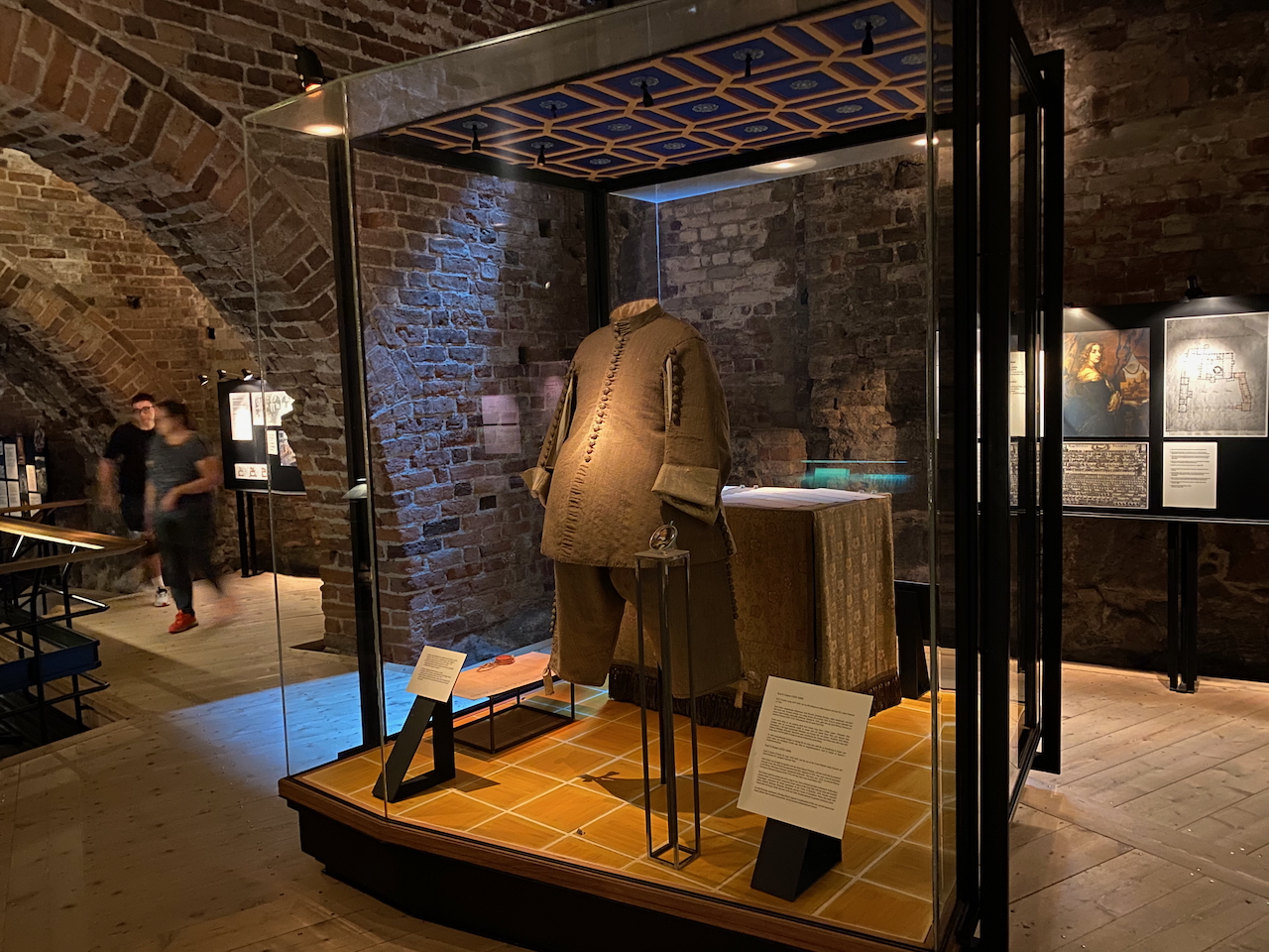 Der Besuch des Schlosses ist anstrengend. Zum einen wagen wir den Spaziergang durchs Schloss ohne Führung, ohne Infomaterial und ohne Guide. Zum anderen erschlagen uns die Eindrücke zunehmend, ähnlich wie gestern im Vasa-Museum. Der Punkt ist irgendwann erreicht, an dem wir durch die Räumlichkeiten schlendern und kaum noch ein Auge für die vielen sehenswerten Details übrighaben. Etwas Geld für einen weiteren Magneten ist jedoch noch übrig und dann wechseln wir umgehend in das dritte Museum am heutigen Vormittag. Das ist kulturelle Druckbetankung pur! Während ein Teil der Geburtstagsgesellschaft nun endlich das Abba-Museum entern kann, andere sich die Stockholmer Altstadt im Hellen betrachten und Eis essen gehen, schauen wir uns in den Schloss-Katakomben das Museum über die Burg „Tre Kronor“ an. Im Jahr 1697 brannte die Burg „Tre Kronor“ komplett ab und das heutige Schloss wurde auf den Ruinen der alten Burg errichtet. Die Verantwortlichen für den Brand wurden zum Spießrutenlaufen verurteilt.