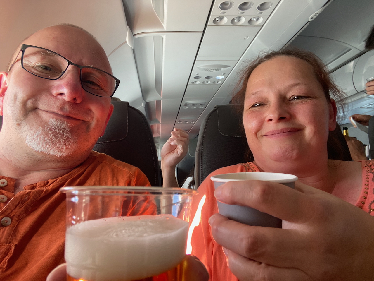 Wir gelangen ins Flugzeug, das heute richtig gut gefüllt ist. Viele leere Plätze lassen sich nicht ausmachen. Plätze 15 E und 15 F sind unsere. Heute gibt es kein WLAN, was Esther sehr bedauert, da sie wie gewohnt den Flug online beobachten wollte. Als die Stewardess sich nähert, entscheiden wir uns zur Feier des Tages zwei Kaffee und die Dallmayr-Pralinen zu bestellen. Kurz bevor die Stewardess uns erreicht, hören wir, dass die Getränke heute kostenlos sind. Weshalb erfahren wir nicht. Statt des Kaffees bestelle ich mir ein Bier. Auf die Pralinen verzichten wir.